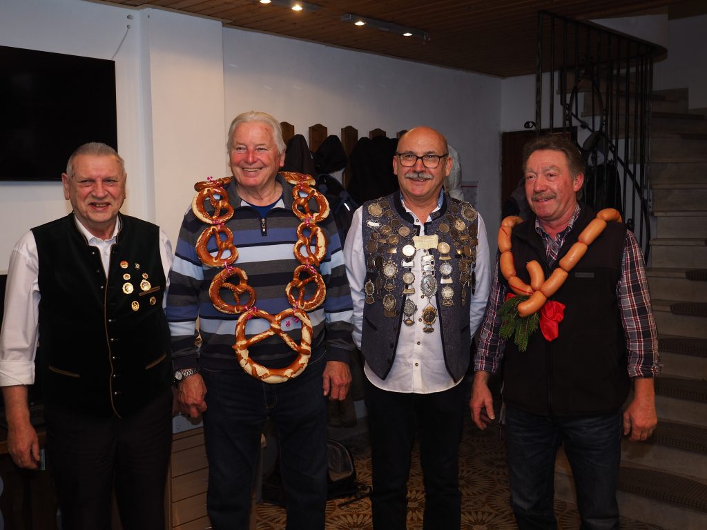 v. li. Wurstkönig: Stefan Ritter, Mooskönig: Louis Bokelmann, Brezen-König: Leonhard Oswald und 1.Schützenmeister von Frisch Auf Graßlfing:  Werner Rohm jun.