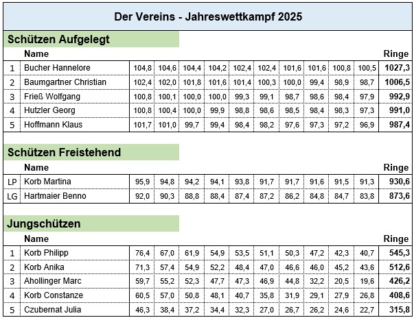 Es wurden die 10 besten Punkteschützen des Vereins zusammen gezählt das